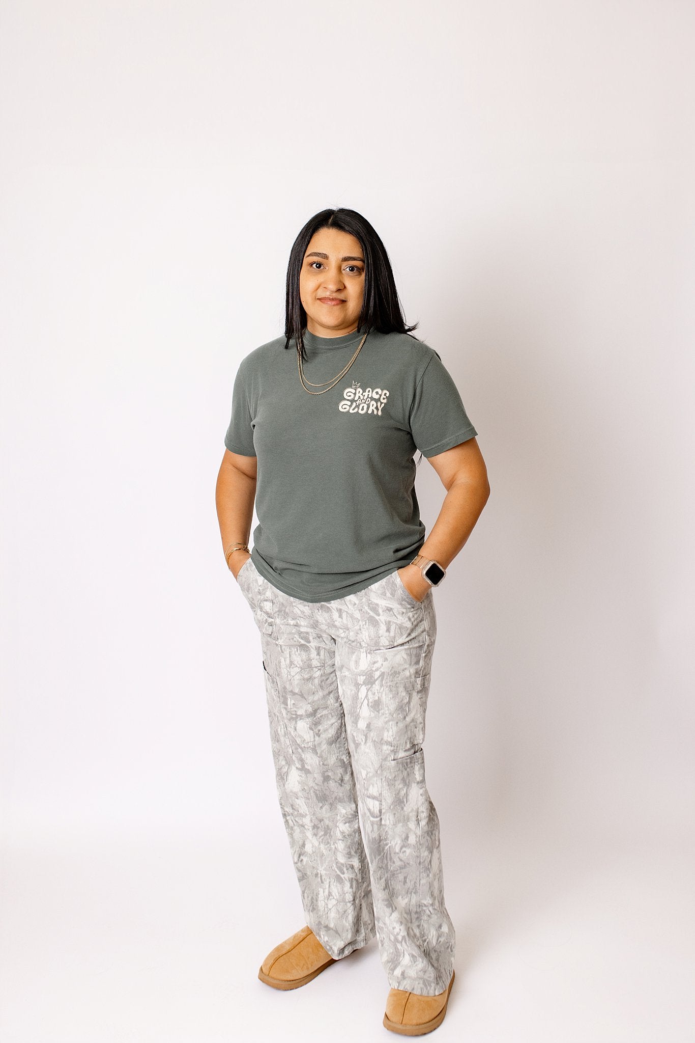 Faith meets fall style in our Child of God Tee, now in Moss Green Comfort Colors. Featuring our Grace and Glory logo on the front pocket and bold Child of God design on the back, this Christian pocket tee is both meaningful and effortlessly wearable.