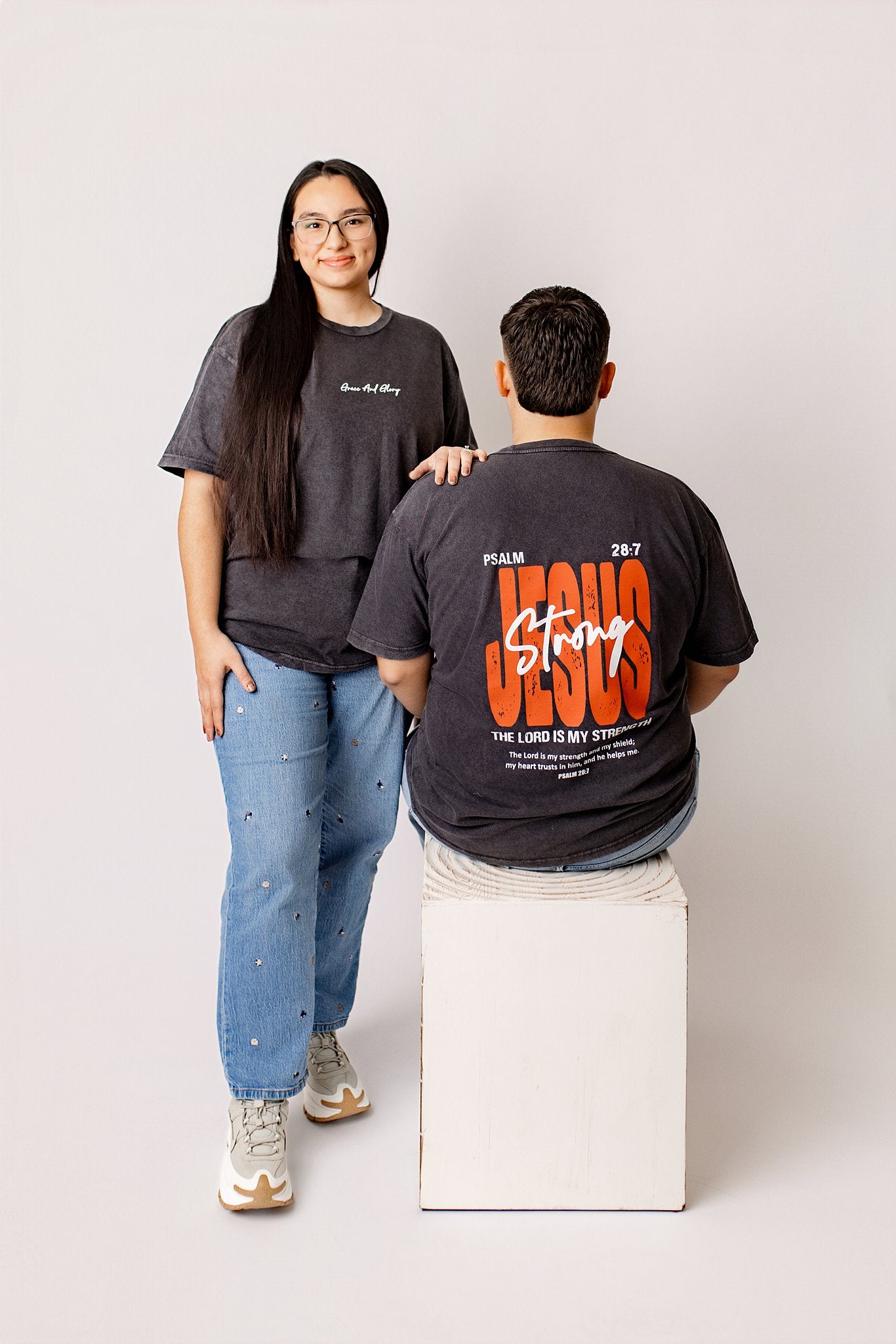 The front features a clean, cursive Grace & Glory design centered on the chest—simple, intentional, and grounded. The mineral wash gives each shirt a slightly unique finish, a quiet reminder that faith is lived, not manufactured.