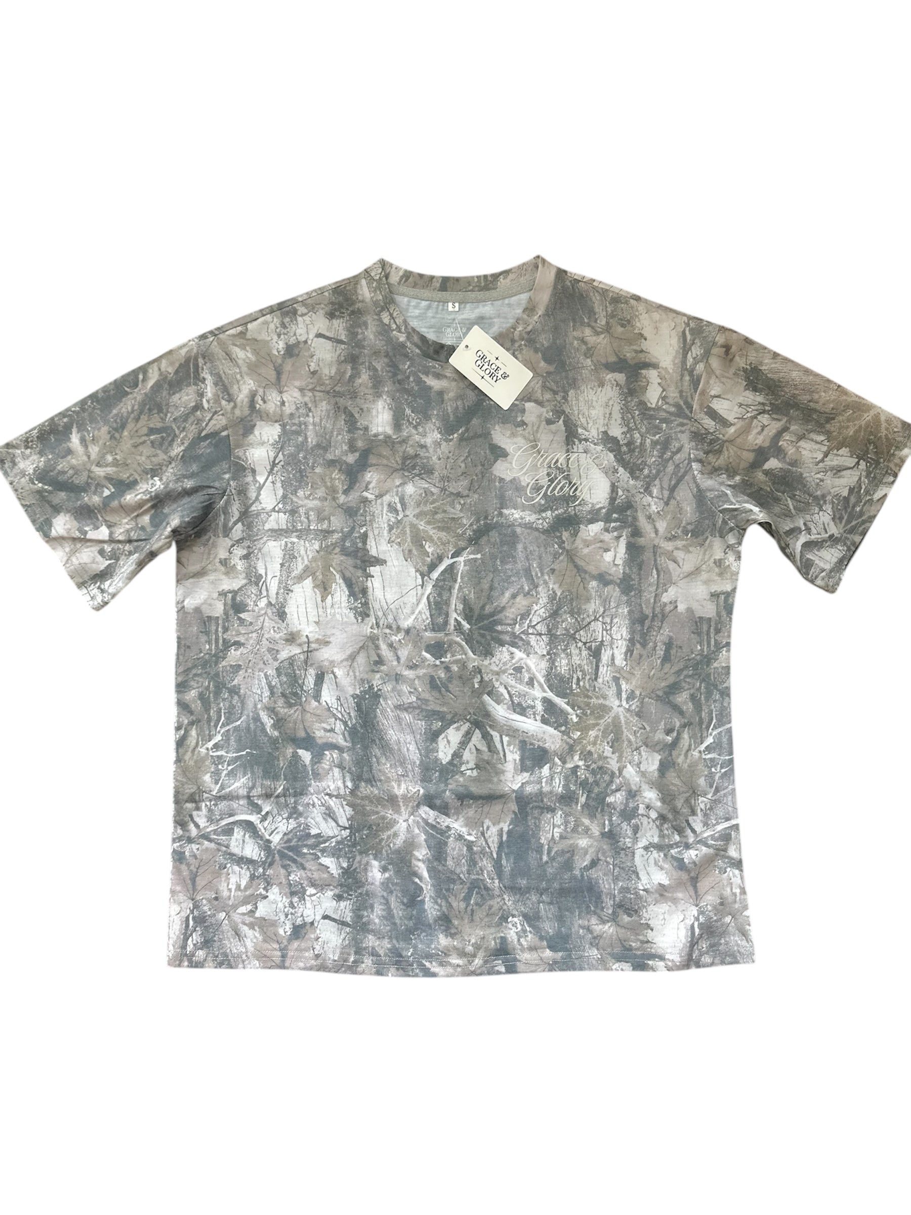 Featuring an all-over tree camo print, a subtle Grace & Glory cursive pocket front, and an eggshell typography back design declaring “The Lord will withhold no good thing” with the full Psalm 84:11 scripture along the hem, this tee was made to carry truth with quiet confidence.